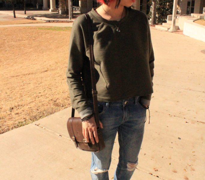 My first impression about this Fashionista is her hair style. The neo-pink color does stand out because of her natural dark hair. As you can see, she has a simple style, wearing a plain T-shirt, worn blue jeans, and a pair of dark, simple Vans. If you are a fan of the Vans brand, as I am, black shoes should be your must-have items in your closet. Indeed, it’s clever to pick a simplistic style as a back-to-school outfit because it saves times and easily mixes with a variety of accessories. I’m loving her bracelet and necklace. Her bracelet looks like black chains which are cool, and it also matches with her necklace that perfectly reflects shiny effects under the sunlight. Without these items her long sleeved, dark green T-shirt looks dull. Moreover, as a fan of leather items, I’m down for her purse that has a dark brown color, which is humble and elegant enough to harmonize with her style.