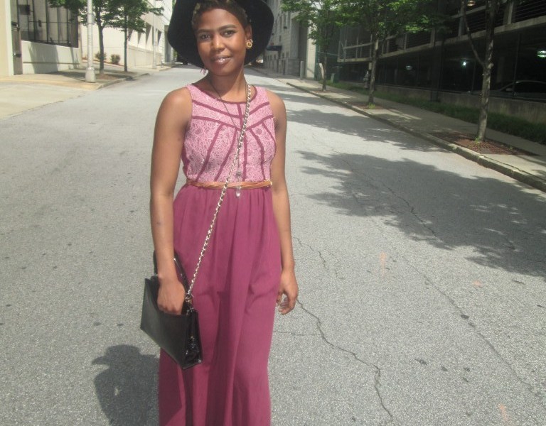 This Fashionista embodies the bohemian style as she is spotted wearing a purple maxi that flows down perfectly to her ankles but not so long that it doesn’t show off her funky sandals. The gold in her shoes accentuates her black, gold and shiny cross-body purse that rings off a vintage Chanel vibe. To add on to the boho look, she spots the classic floppy felt hat that has become an essential accessory to every Fashionista’s closet this season. Finishing up this carefree and flowy look, our Fashionista incorporates a crucial element to her outfit by adding a handmade crystal necklace that bounces off her light brown belt, fitting comfortably around her waist.