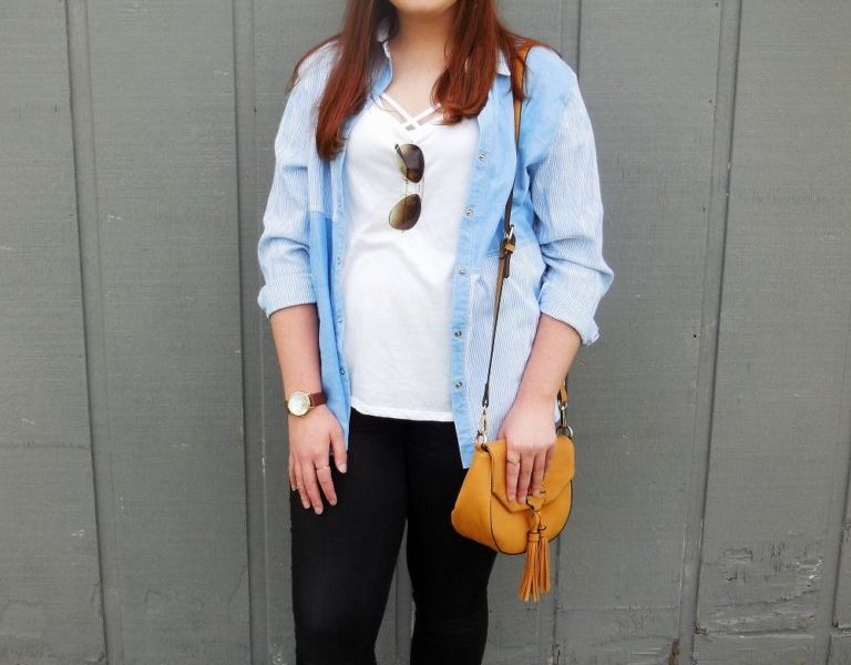 I am back with another pair of black skinny jeans—I swear I own other jeans, I just happen to really like black skinnies! I decided to put a cage-like camisole underneath my plain white T-shirt to add a unique twist. My blue denim chambray shirt is a thrifted find and I absolutely love the style of it. It has striped panels on opposite sides and I think that it really adds to the outfit!