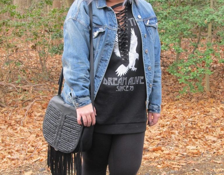 This Fashionista’s look is comfortable and fuss free with touches of trendy details adding to its flair. She paired leggings from Garage with a printed lace-up sweatshirt from Forever 21. Then, she wore a jean jacket from American Eagle Outfitters adorned with pins. The super cute pins are purple lips, a lipstick tube, and a Sephora logo placed on both upper pockets that really pop against the denim jacket. Booties and leggings are always a good choice. This Fashionista went with a pair of ankle boots from Charlotte Russe. To complete her look, she opted for two of her favorite things in one piece: a cool leather saddle bag from BCBG with fringe.