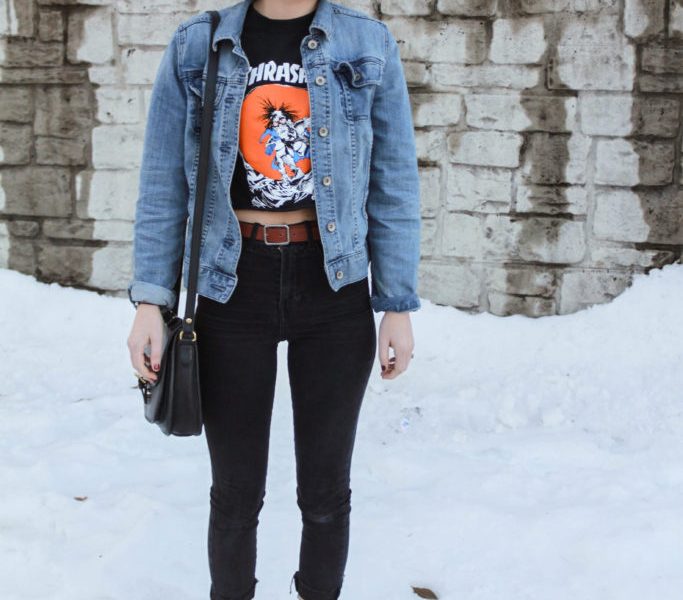 Now that cold weather is here, denim jackets are a staple in any Fashionista/o’s closet. This Fashionista wears her denim jacket paired with a black T-shirt that highlights the grunge/skater aesthetic. The light wash of the jacket pairs perfectly with her black skinny jeans and black T-shirt. All these pieces individually are pretty simple, but the way this Fashionista pairs them together creates a more attention-grabbing, grunge look.