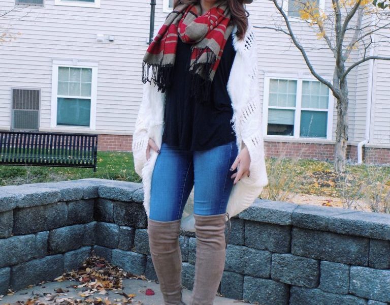 It is obvious that the main feature of this look is the hat but, the outfit would be nothing without all the other pieces. Pairing your favorite pair of skinny jeans with tight over the-knee-boots is a MUST. And let me tell you, this Fashionista is doing it right; the color and the lace-up detail in the back is a perfect match to her hat. Her Forever 21 scarf adds the subtle pop of color that she needs. Her absolutely adorable oversized white American Eagle cardigan is sweater goals.