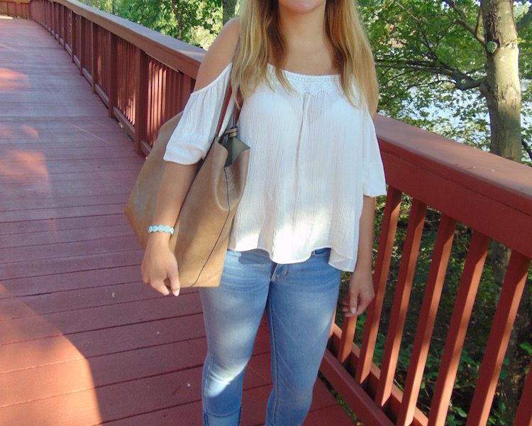 The simplicity of her outfit combined with the hair accessory makes for a cool-but-casual look. Her off-the-shoulder shirt paired with light denim jeans and a pair of sandals is based off of essentials every Fashionista should have in her closet, and leaves room for the main focus of her outfit to shine. She completes her look with a light blue bracelet that compliments the colors in her headband, and a leather tote bag to hold all of her necessities for the day.