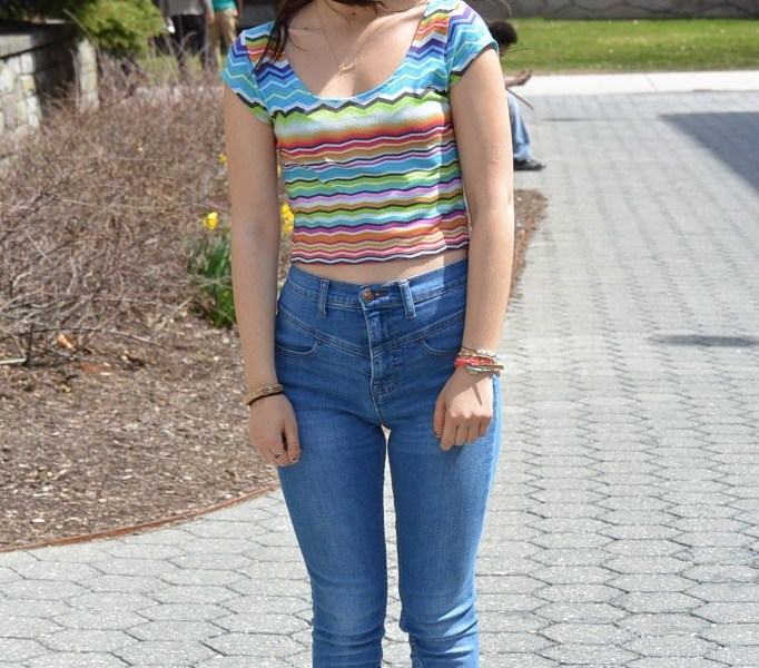 I spotted this Fashionista rocking an outfit sure to impress anyone from the ’80s. Her hipster throwback vibe definitely made her a standout across campus. We can send a special thanks to Madonna who started the international crop top controversy. In 1983 she appeared on stage in a tremendously revealing mesh crop top. This uproar started to bring crop tops into many mainstream stores. This Fashionista paired her hippy-dippy top with a light wash denim pair of jeans-sure to complement this throwback vibe. Finding the right pair of high-waisted jeans can feel unbearable at times, but finding the right wash can be the first step. Urban Outfitters has a tremendous array of jean styles that will be sure to knock your socks off.
