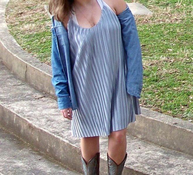 My favorite piece of this entire outfit would either have to be the jean shirt/jacket or the cowboy boots. I wear the jacket all the time. I’ll wear it with a sweater, scarf, and pants when it’s colder or I’ll throw it over a dress like I did here when it’s warmer. It is very convenient to have a bulky light layer I can just throw on in various weather. The cowboy boots I got as a birthday present this past November when I had a trip planned to go to Tennessee and I wasn’t sure if I had time to buy boots there. Unfortunately the trip was canceled, but I still got a great pair of boots out of it.