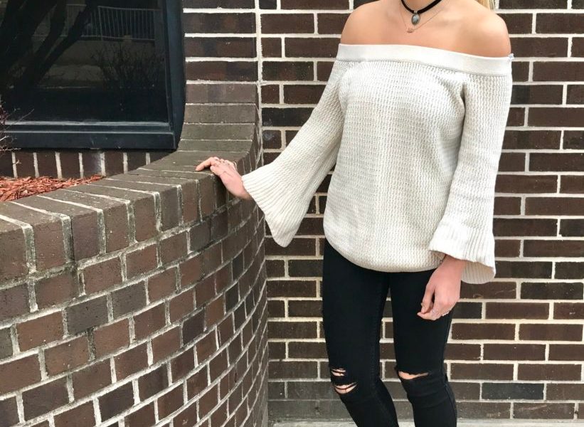 This Fashionista from Penn State University is looking effortlessly chic as she strolls through downtown State College, PA on a chilly January afternoon. Her off-the-shoulder sweater with flowy, bell-shaped sleeves is complimented perfectly by her pendant choker and gold chain necklace.