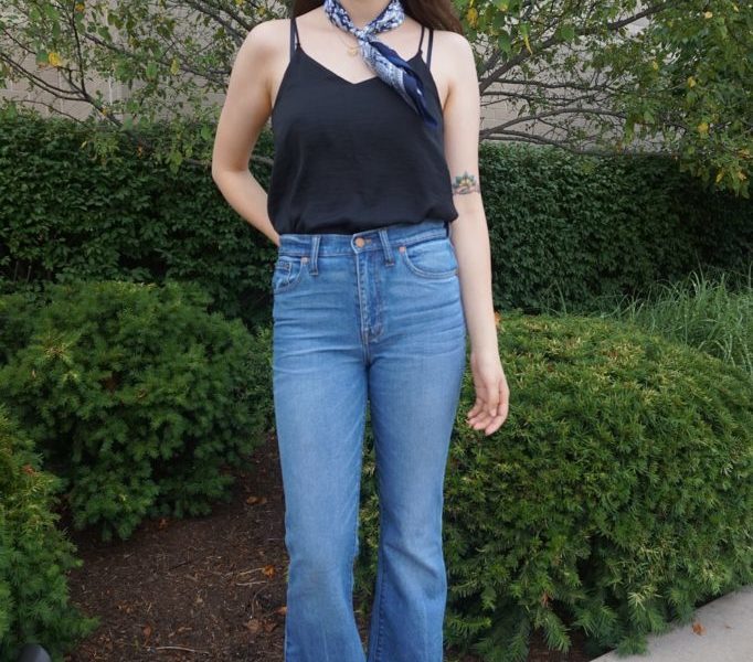 This Fashionista’s look is the epitome of the minimalist chic style many strive to achieve. First, she is wearing a simple black camisole top which is a great piece for layering in the spring and fall or wearing alone is the summer months. In keeping with the ’70s vibe with the bandana neck tie, she chose a pair of timeless Madewell Flea Market Flare Jeans. These tie in so well with the loose, effortless vibe of the rest of the outfit. Plus, flares are making their own comeback this year too! (were flares ever really out of style to begin with though?).