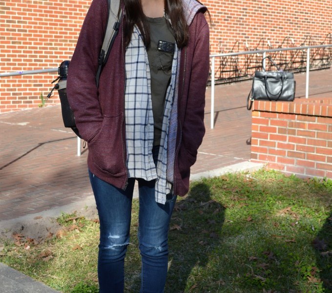 She added a neutral flannel as the second layer of her outfit. Flannels are quickly becoming a wardrobe necessity because of their versatility. They can be worn throughout every season whether with shorts and a tank top or wrapped at the waist with a flirty dress. This Fashionista wore her flannel unbuttoned, which helped show off the sparkle on her shirt.