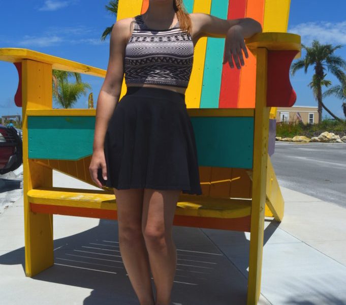 This Fashionista is sporting mirrored lens aviators in a burnt orange and red tint. These sunglasses in particular came from a store in Europe. She found these after she had broken her original sunglasses while traveling, but they were certainly a trendy and lucky find. This Fashionista is using her sunglasses as a bold-colored statement piece by pairing them with a black and white ensemble. Her mixed-print cropped tank top and high-waisted black skater skirt keep her dark summer look stylish and allows the sunglasses to add a nice pop of color to brighten up her overall look without causing a distraction. I expect we will be seeking out our darkest black and richest brown sunglasses for the upcoming fall season, but for now let’s enjoy the fun-loving vibes of vibrant colored lenses for summer.