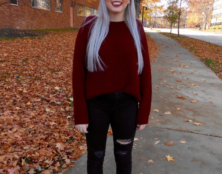 Everyone has heard of sweater weather, but the accessories that this Fashionista has added onto her outfit are what make it trendy and cute. Three trendy must-haves this season are ankle socks, bralettes and clear round framed glasses. In chilly weather it is easy to be simple and forget about the details, but this Fashionista definitely did not. A big color this season is maroon and the matching maroon knit sweater and cabin socks definitely top off her outfit game.