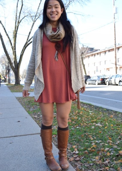 The beige cardigan and matching infinity scarf are the perfect duo to take on the fall weather. This hue can complement just about any outfit and the chunky sweater materials add the right amount of warmth. The chestnut color is present in the faux leather bag, complete with fringe detailing as well as her faux leather riding boots. The choice of the chestnut faux leather adds a bit more sophistication and polish to this look. Finally, we have the swing dress with a sassy and sweet silhouette, making it the perfect spot to add the pop of color.