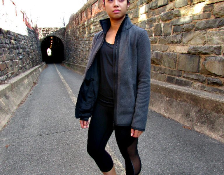 For this workout, our Fashionista went for a classic black and white look with a pop of color from her headband. From afar, her clothing may look like a pair of simple black leggings and a tank top, but up close you can see the mesh cut into her Lululemon leggings and in the back of her tank top, allowing her more breathability during her workout. To give her look some more dimension, she pairs her black tank top with a white strappy sports bra and all white Adidas. Since the weather is colder, she also added a Lululemon thermal fleece zip up jacket to complete her look. With her hair tied and Fitbit strapped on her wrist, she’s ready to make the most out of her workout!