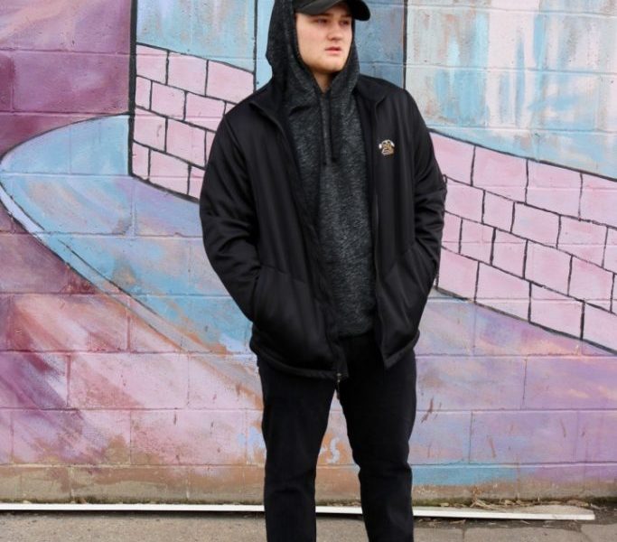 Rather than a basic all black pair of socks, this Fashionisto added printed socks. He also rolled up his pants so they were visible. Sticking with the black theme, he chose to wear a pair of black shoes that had hints of brown and white so there was a little more going on that just plain black. For his sweatshirt, he wore a dark heather gray hoodie to differ from the black jacket and pants, but still not have an overwhelming color difference. Lastly, for his jacket, he wore a bomber-like style with a symbol on it instead of just plain black. This way, there is something to grab a person’s attention, but again, it’s not overwhelming.