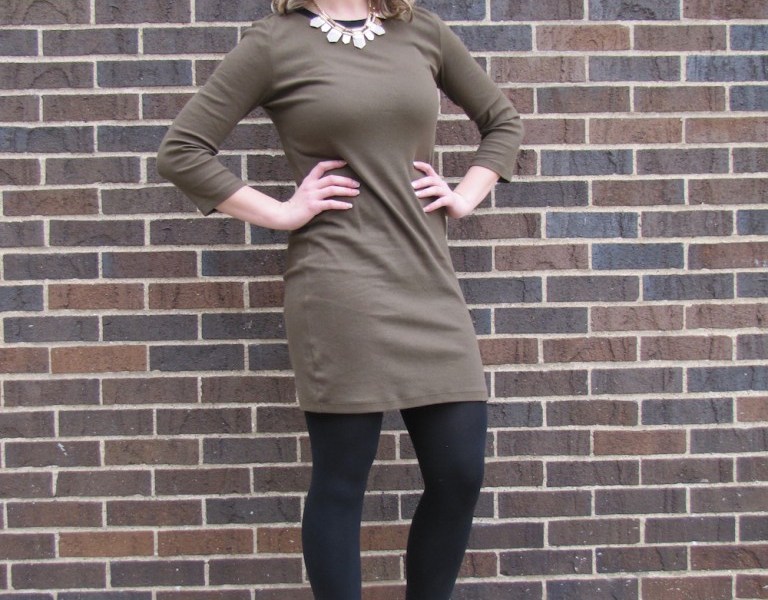 How To: This Fashionista’s chic look can be duplicated by starting with a simple, form fitted, olive green sweater dress and black tights. Right now, the look is casual enough to wear to class, work or a lunch date, but adding on a pair of sassy black booties and golden accessories would really spice it up for a more stylish appeal. A glitzy gold pair of earrings and a statement necklace complement the organic olive tone and brighten up the look immensely.