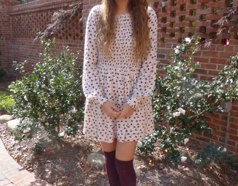 I spotted this Fashionista walking through campus and immediately fell in love with her attention to detail. The white patterned dress and the burgundy high socks completely embody the pop of color. The patterned dress is muted enough to be considered fall attire, but the pattern itself makes it fun and flirty. The high socks provide warmth as well as another pop of color to the look. Her big gold earrings attempt to steal the show with their elegance and sparkle. The beige booties tie the entire outfit together. This look proves that it is possible to look cute, colorful and still be fall appropriate all at the same time.