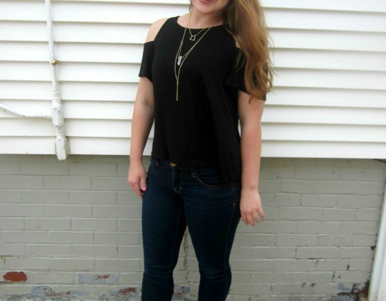 This Fashionista knows how to play around with the cutout trend to create the perfect outfit that will sure turn heads. Keeping it classic, this Fashionista stuck with an all black, loose fitting short sleeve top with cutouts on the shoulders. Since this top is a solid color, it is very versatile and can be dressed up or down. This Fashionista went the simpler route by matching the black top with a pair of dark wash jeggings. Spicing it up, her black, caged chunky heeled sandals go along with the cutout trend and lead the eyes throughout the outfit making it harmonious. The delicate, gold-layered necklace adds just enough flare to finish off the look. This dark palette outfit contrasts perfectly with the Fashionistas’ glowing, fair skin tone and vibrant strawberry blonde hair.