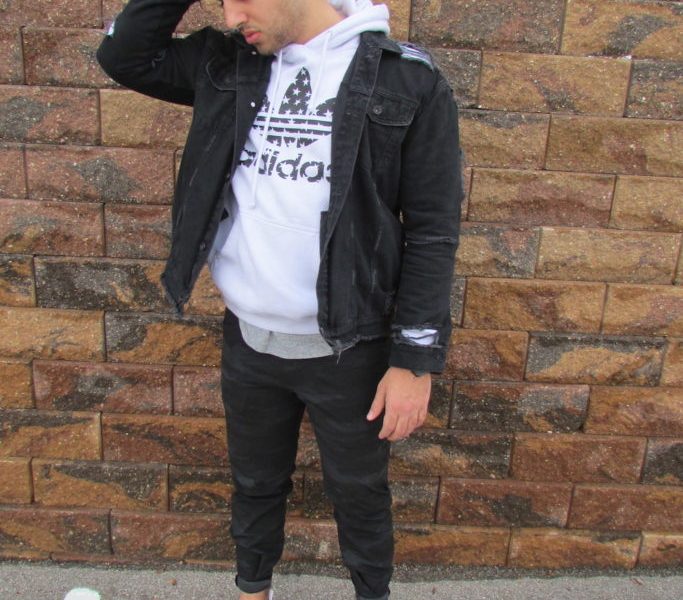 This outfit combines winter vibes of a ripped jean jacket with casual, comfortable slim-stretch jean for maximum comfort and style. The black jean jacket is a neutral color allowing it to be versatile to use in many outfits. The long t-shirt adds layers with the jacket and sweatshirt.