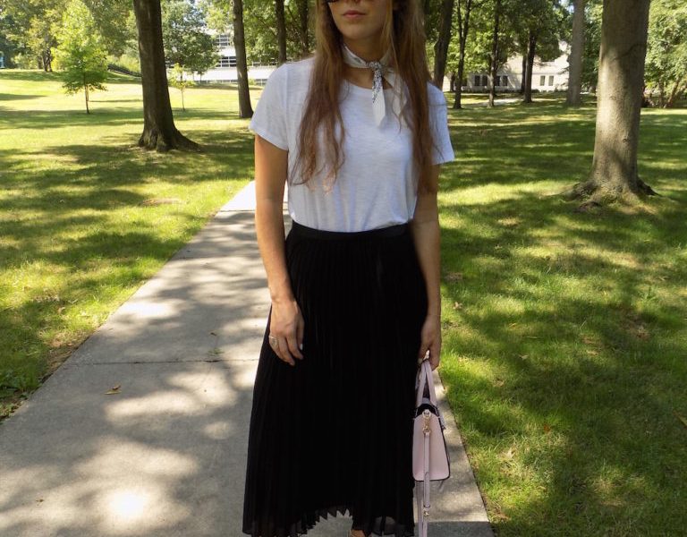 For starters, this Fashionista pairs an extremely elegant, pleated black midi skirt with a basic white T-shirt; this creates a perfectly clean slate to dress up depending on what vibe you’re feeling that day. The next step is to choose which accessories you think would go with your piece. For this look, the Fashionista chose to tie a thin white bandana around her neck, which is currently one of the biggest trends in the fashion industry. Another major trend right now is the lace-up pointed ballet flats, which is what this Fashionista is also sporting in her look; can you say trendy? For the final few pieces of her look, this Fashionista grabs her round black sunglasses and her baby pink Rebecca Minkoff cross-body. I feel that each of these two accessories are perfectly chosen due to their elegance and ability to add to the look without being overwhelming features.