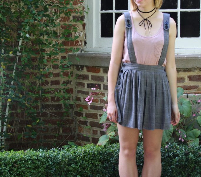 She first caught my eye with the centerpiece of her outfit–this quaint gray jumper. The plaid pattern and slight pleated detail on the skirt are elements well associated with the classic prep school uniform, but here they serve also to create structure within her outfit. She balances this structure with her loose-fitting tank top underneath the jumper, a testament to the importance of comfort and breeze when trudging through campus during the last, longest days of summer heat. The large black buttons vertically lining both sides of her hips and the suspender-like straps on her shoulders add a playful element to her ensemble as well.