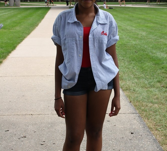 The Fashionista maintained a summer aesthetic by sticking to a red and blue color palette throughout her outfit. Her denim shorts are a classic, informal element. They exude “forever summer” and are also a great transition piece between the summer and fall seasons. Since the heat is still real in the Midwest, shorts are a wardrobe must, but as the cool, autumnal air sets in, a pair of cute tights or leggings could be thrown on underneath the shorts to provide warmth and a pop color. Pair those with some sneakers or boots, and you would be set for fall!