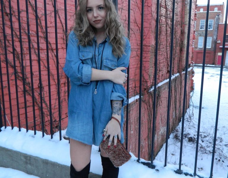 This Fashionista took a simple oversize denim shirt and with the addition of some killer accessories created a super edgy ensemble. Let’s start with the shoes. Over-the-knee boots are a trend that show no signs of stopping anytime soon. When paired with an oversize shirt like this Fashionista has done, it is effortlessly cool and instantly dresses up even the simplest outfit. What I think really elevates this outfit is the jewelry. Another trend that isn’t going anywhere is the choker. Instead of the classic black choker this Fashionista opted for a super thick beige choker. In addition to the choker, she layered some gold necklaces and a drop choker necklace. What I love about the drop choker necklace is that she didn’t wrap it. It adds another dimension to her layering without taking away from the beige choker. We can’t discuss this look without talking about those amazing rings. Rings may be my favorite jewelry item so I say the more the merrier! This Fashionista has a variety of super cool and intricate rings. My favorite has the be the one that reads “wicked woman” because in this outfit that is exactly what she is. Finally, our Fashionista added a faux fur clutch to keep her phone, money, and a her lip color in. A little bit of fur in the cold weather can go a long way. It’s opulent, comforting, and as classy as it comes.