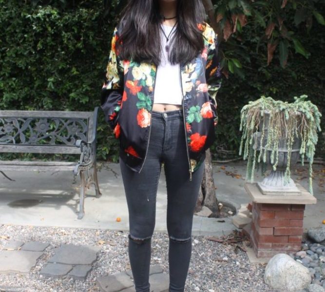 Though this jacket has some edge in a jet-black hue, the all-over floral print adds a bold, feminine touch. Paired with the bomber shape, it screams confidence. When you have a large pattern that covers the whole garment, I feel it’s best to keep the rest of your outfit simple, like Emily did with a solid colored ribbed crop top and charcoal gray jeans, trendily ripped at the knees. This Fashionista topped her look off with a precious stone amethyst choker and platform shoes.