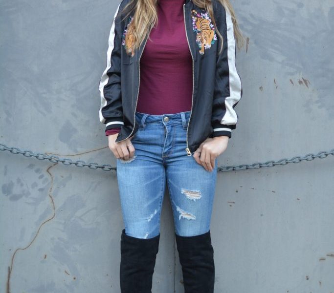 I’ve heard the struggle of questioning how to pair the bomber jacket from fellow fashion lovers. Try going for a body hugging dress and choker or do what this Fashionista did and keep to the basics. The maroon turtleneck and light-washed distressed denim work so nicely with the bold jacket because they are simple without looking boring. When in doubt grab the basics.