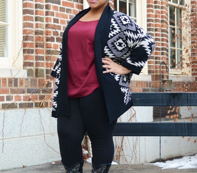 This Fashionista keeps it simple with a pair of black leggings and a red top. When it comes to comfort, leggings are the king. I still cannot wrap my head around how a piece of clothing can be so comfortable, yet stylish, at the same time. To spice up her look a little, this Fashionista wears some simple jewelry and a pair of cowboy boots. Boots are always the perfect choice when walking across campus in the slushy snow. Of course, she is finishing off her look off with an Aztec printed cardigan. This cardigan adds interest as well as warmth, great for cold days when you just want to throw something on and head out the door.