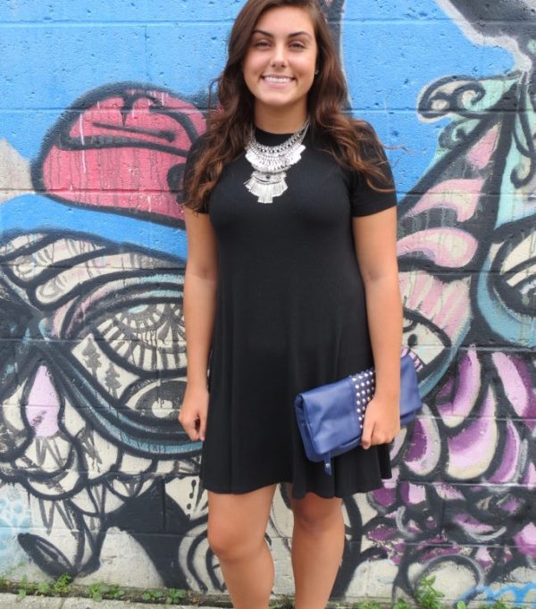 Details can very easily make or break the look you’re going for, but in this fashionista’s case details make the look! Her pairing such a bold silver necklace with a plain black t-shirt dress really brings all the attention to the statement necklace. Which is exactly what she was going for, having such a strong contrast with the black and silver to really make the necklace pop. The dress is the perfect little black “summer” dress that is cool and can be matched with anything.
