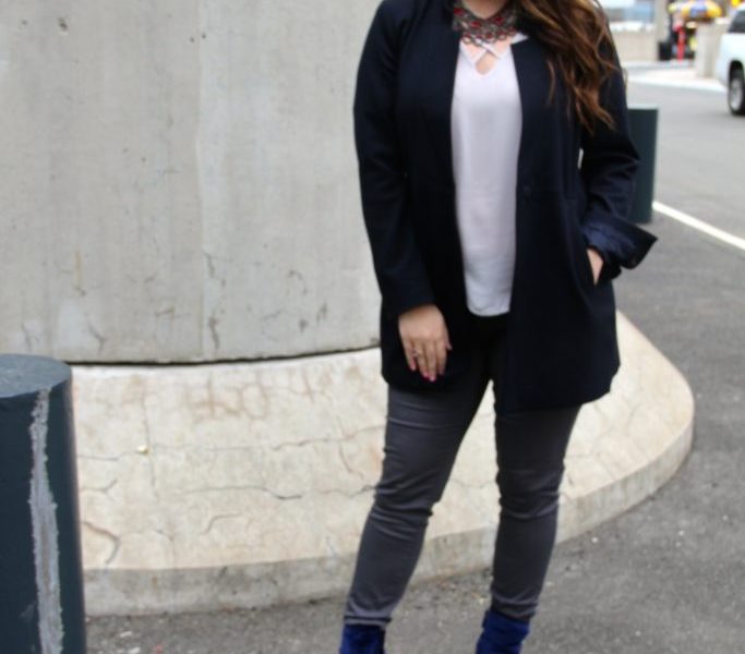 Her day-to-day look is usually very bohemian/rocker (think Rebecca Minkoff). She took that aesthetic and channeled it in to her outfit details to create a look for a professional function that allows her personality to shine through as well! She kept the base of her outfit neutral with some simple gray jeans and a short-sleeve cream blouse. Now with a blank canvas as an outfit she added layers with her long blazer and a statement necklace as the perfect stand-out accessory that helped to better express her personal style! Throw on some velvet booties for a finishing touch that will surely pop.