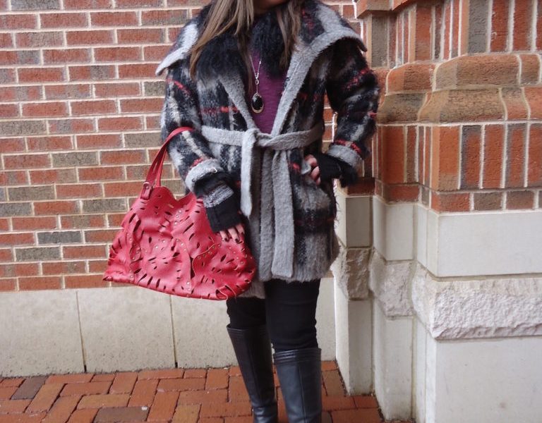 Echoing winters darkness, she stuck with a black and gray palette, yet by adding a pop of various colors throughout her look, this Fashionista makes winter less dreary. This gray, wool sweater coat with a black and red pattern keeps this Fashionista warm and makes her stand out in the sea of puffer jackets on campus. By adding this faux fur, black Mongolian fur collar to her ensemble, this Fashionista’s winter look becomes even more distinctive. This vibrant plum, long sleeve turtleneck cohesively fits in with her ensembles color palette. One can never go wrong with jewelry, so this silver chain necklace with a black stone is the perfect addition to this look.