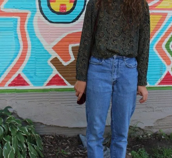 This totally thrifted look screams vintage, from her high-waisted cuffed jeans to her tucked-in floral top. The whole outfit is coordinated around warm colors, welcoming the month of October with open arms and (velvet) purses, ready to spend money on that perfect latte. I love that to complete her look, she added the cross-body purse, which can alter the vibe from casual to chic. This Fashionista’s style totally is affordable, too, which us college students are totally about.