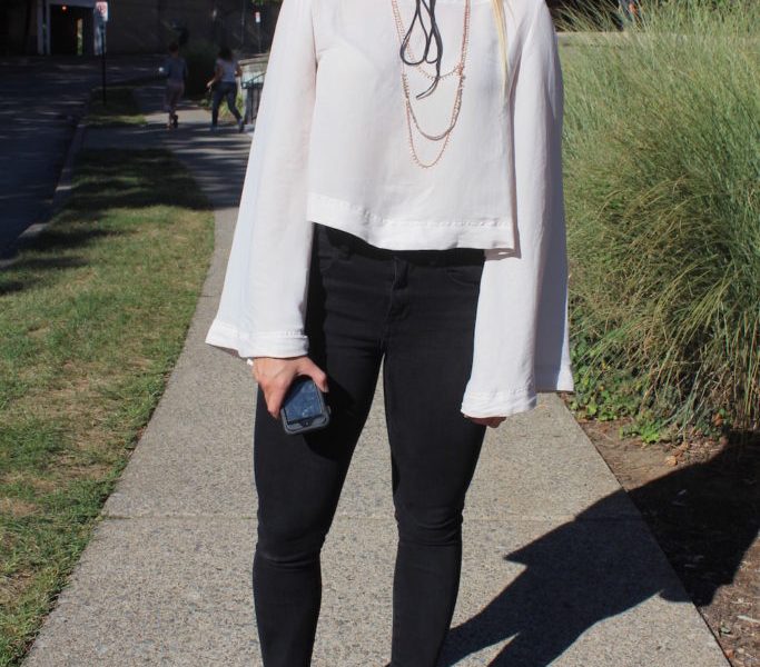 Jax is a semi-quiet girl with touches of spunk in her and her style definitely parallels that. For her outfit she wore a simple cream blouse with a sheer-like material and a dramatic sleeve. To play up on the natural midline of the shirt she decided to stack jewelry pieces and if you know me, I am ALL about the stackables! The rose gold longer chain compliments the light colored blouse, while the black choker unifies the outfit by drawing the eye down to her dark pant.