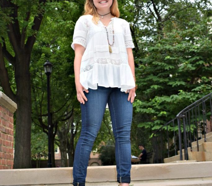 The accessories make this look. Without them, this outfit would be beautiful as well, but the addition of the layered necklaces adds subtle style that makes this look perfect for class. The beauty of this look is that it’s incredibly versatile based on your accessories, though. This would be appropriate for a laid-back interview, class, a date, brunch with friends and so on. Change up your hair or necklaces and you can use these same key pieces for any event.