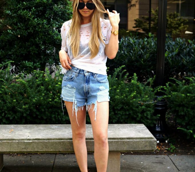 This Fashionista dressed in casual pieces, yet she stands out because each boasts a modern update. Her distressed Millau top is anything but a plain white T-shirt. The small holes capitalize on the trend that we saw all over our Instagram feeds after Yeezy popularized it in his first collection. This Fashionista paired her T-shirt with ripped LF Furst of a Kind vintage denim shorts, sticking with a distressed theme.