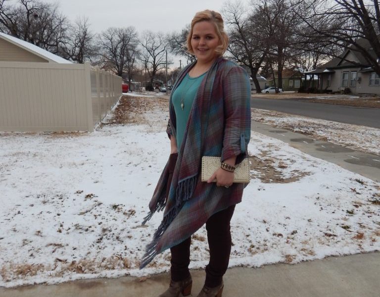 Plaid is a must to have this season and this Fashionista has paired her plaid cardigan with a turquoise T-shirt and some maroon jeans. These colors together help pull the pattern out of the plaid cardigan. She chose to add a little western flair with lace-up, chunky style heeled boots. These are not only fashionable, but also functional to keep her feet dry and warm above the snow and ice. Her accessories included a moon drop stone style necklace on a long gold chain, and a brown leather bracelet with laced gold bars vertically placed apart along the leather band. To complete the ensemble, she chose to carry a cream clutch, which complements the color dynamic of her plaid cardigan.
