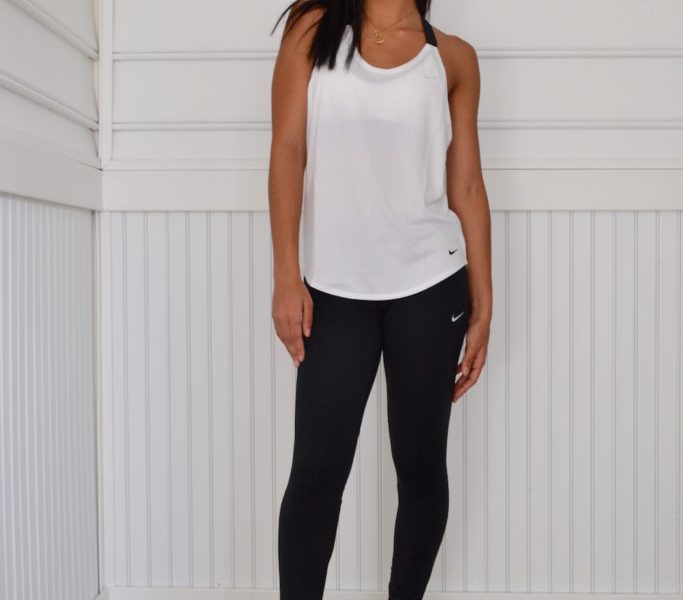 This Fashionista followed all the do’s of the athleisure trend. She has long, slim legs, therefore the full-length leggings make her legs looks even longer, and fit her perfectly. She kept the whole outfit very simple by pairing black and white, which is always a great decision. She is wearing a simple white tank top with a sports bra to match. When it comes to athletic tank tops, many of them make your bra very visible, which is why it is very important to make sure whatever you are wearing underneath is not only cute but also matching. She paired her super simple outfit with all-black Nike sneakers. While I think you can absolutely pair a simple outfit like this with a colorful sneaker, it is always a safe bet to go with black.