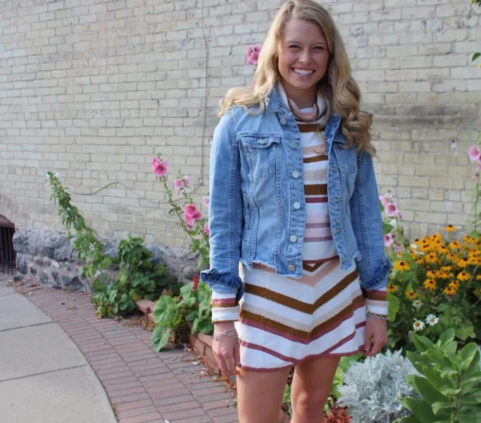First, she started off by throwing on a two-piece sweater set from Free People. This cute knit set features a retro striped print in addition to the high neckline and flared mini skirt. The texture of this outfit is soft, cozy, lightweight, and perfect for the transition in weather. The warm neutrals in this outfit are perfect for casual wear this back to school season.