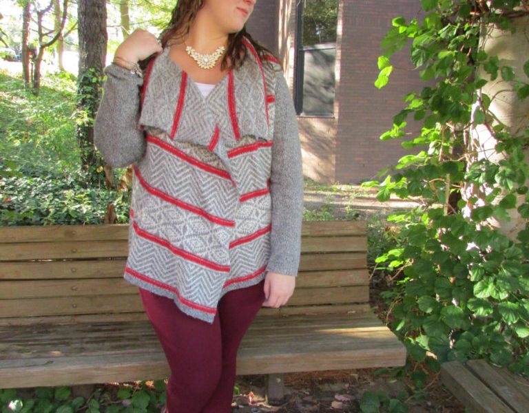 Her white necklace with flowers shows her slight unwillingness to let go of the warmth and beautiful weather that we have been blessed with so far. Uggs are perfect for this weather because they keep your feet warm. When I wear heels in this weather, my feet often get very cold. The red jeans add the Christmas feel and go great with the gray patterned sweater. Her outfit makes me very excited for the holidays and Christmas time.
