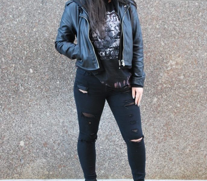 This Fashionista can most likely be seen rocking winged eyeliner. The Kat Von D tattoo eyeliner is the perfect tool to create a sharp looking wing. She balances her eye look with bold brows, and a nude lip. To go with her bold eye makeup, she wears an edgy outfit that is comfortable for everyday. Wearing all-black is an easy way to get dressed in the morning, especially if you spend more time in the morning perfecting that winged eyeliner. The key to wearing an all-black outfit is mixing it up with different textures. Here, she wears a black leather jacket, black ripped jeans, and a black T-shirt.