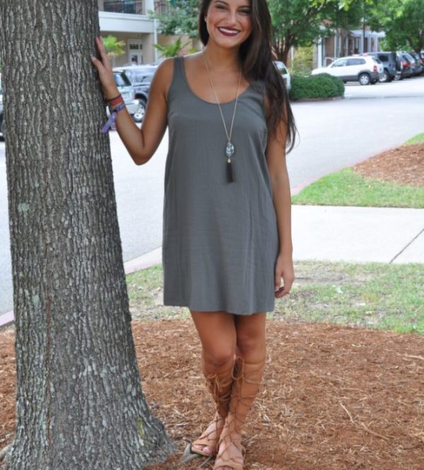 This olive green dress is very lightweight and its cut out back brings an unexpected twist to the simple look. The necklace this Fashionista is wearing matches the olive green color of the dress and helps to effortlessly accessorize the outfit. The tan lace-up sandals are the perfect color to keep the look soft and natural. Makeup plays a huge role in creating a look. This Fashionista decided to go with minimal and eye and face makeup to play up her red and purple toned lipstick. The dark lipstick this Fashionista is wearing adds the finishing touch and its dark color can take this look from day to night. Follow this Fashionista’s lead and add some dark lipstick to your collection!
