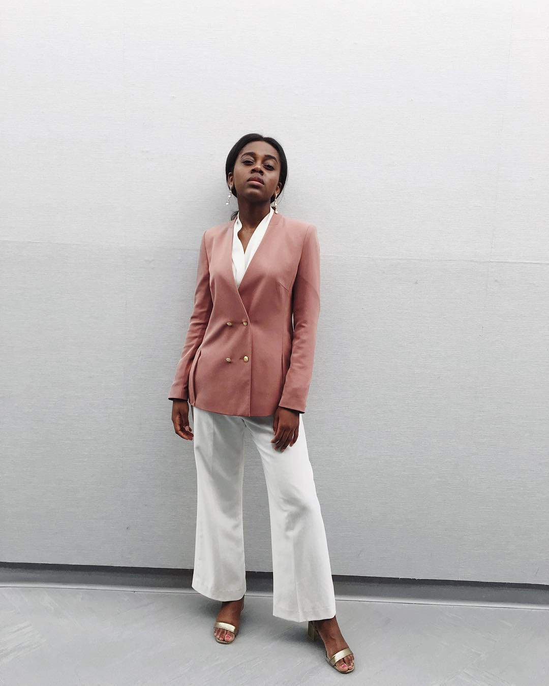 Get the look: DR2 by Daniel Rainn Boyfriend Ruched Sleeve Blazer ($40), H&M Black Wide-Leg Pants ($40)