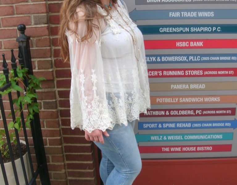 Her white lace top added a hint of romanticism and bohemian aesthete with its front panel and bell sleeves. It’s all-around lace detail and flowing material gives it an edge over more solid tops, making it both breathable and beautiful. Her blue skinny jeans complement the top with their tighter fit, making it more noticeable than if they had a looser structure, and create a nice color palette for her accessories.