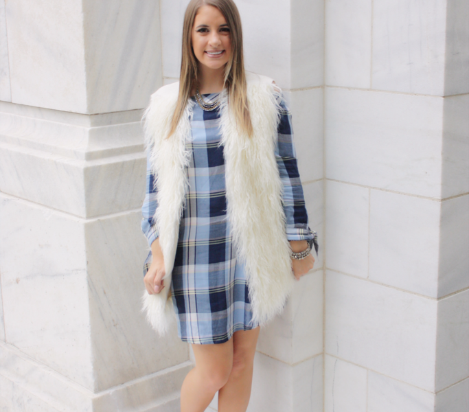 The second way that I styled this look was for a night out, such as going to a party with friends. Wearing the same dress, I decided to throw on a pair of taupe studded heels and a white fur vest which both add to the glam factor. The jewelry I have on is a beaded silver and gold necklace and chunky silver and gold bracelets to match. Lastly, I added some pop to my already-done makeup in a few different ways. To my eyes, I added a brown winged liner to the brown smokey eye that I was going for. I then applied a more blinding highlight to my cheekbones and inner corners of eyes and switched my nude lip to a shiny brown metallic liquid lipstick. I love using makeup to influence the feel of an outfit.
