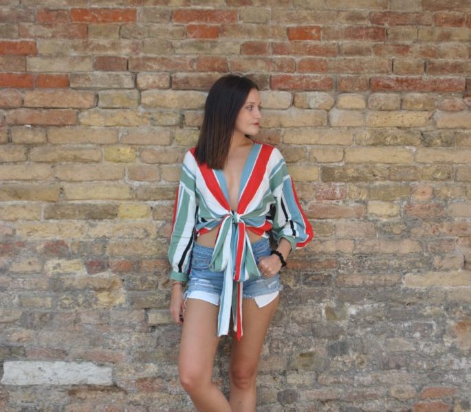 This outfit dresses down a cute wrap tie top from Zara with distressed jean shorts from American Eagle Outfitters, and a versatile pair of classic white sneakers. While keeping the focus on the top, the shorts and shoes allow for comfort when it comes to copious amounts of walking. The trendiness of the blouse goes well with any scenery as it is surely just as eye-catching as the things you will be posing in front of. The pop of color from the top helps to bring to life the surrounding colors as well.