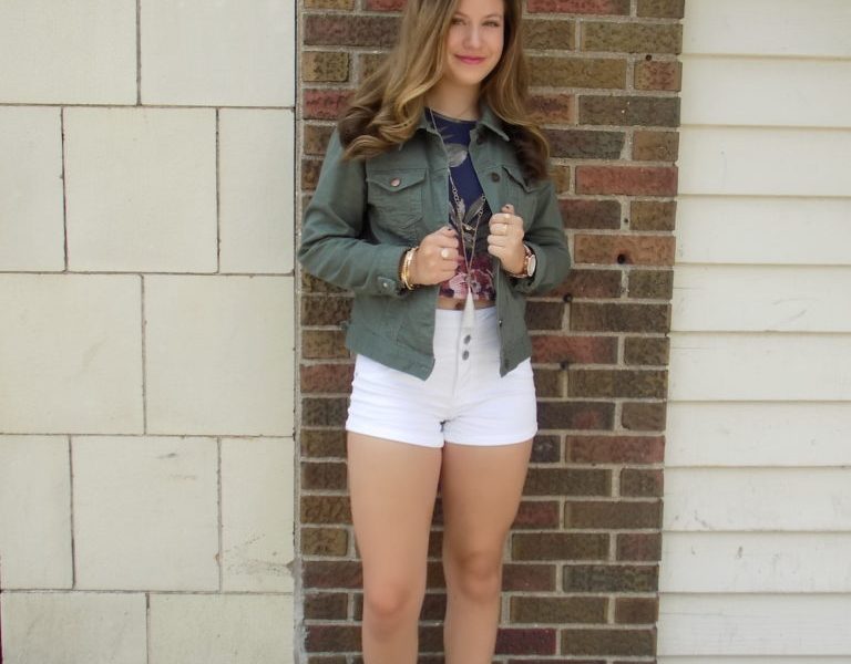 The first time this Fashionista tried on this jacket she was obsessed. She was almost wishing the weather would stay chilly just so she could wear it, but it also looks great when tied around the waist. This outfit was paired with white high-waisted shorts and wedges to give it a fancier look, but you could always wear sandals to be a bit more casual. That is what I love about this outfit—it can easily be dressed up or down with accessories, but has the cute and casual look no matter which you choose.
