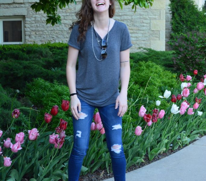 This Fashionista is doing just that. My favorite thing about this look is the gray T-shirt that allows her to show off her “forever young” tattoo. Tattoos are unique to each person, and I love outfits that let that individuality shine. This outfit is casual paired with ripped skinny jeans and fun maroon sneakers. Sunglasses are another great way to show off your personal style. From heart-shaped to classic round lenses, there are so many options that give off so many different style vibes. This Fashionista went with classic gray Ray-Bans that are neutral enough to go with any outfit. She further accessorized with a few unique chain necklaces, and it looks fantastic.