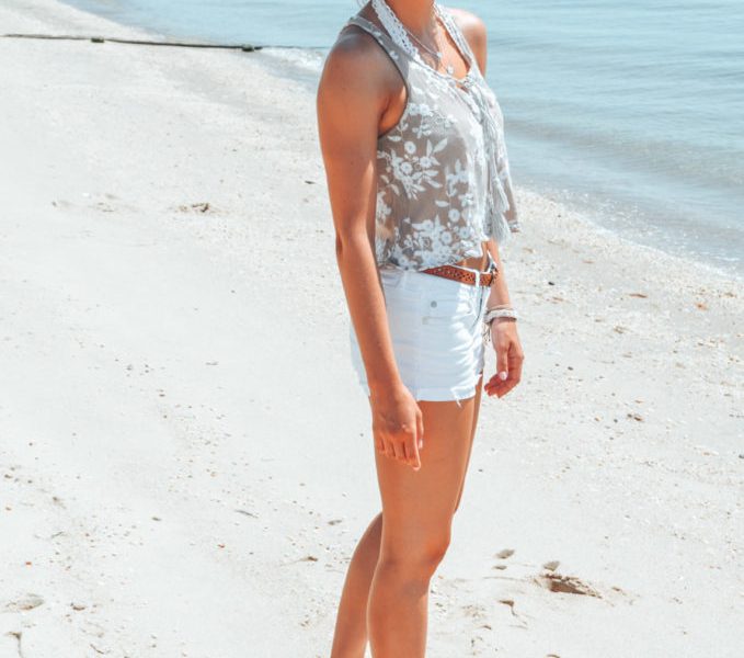 When shopping for summer clothes I like to look for pieces that are quick and easy and will look good on and off the beach. This summer I made sure to get a pair of white denim shorts because they are always an essential in my wardrobe. White denim shorts are easy to dress up and down with the right top and accessories. Also, white shorts help show off your new sun-kissed legs after spending a day at the beach.
