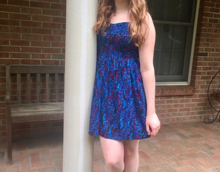 This Fashionista is wearing a casual abstract print summer dress with button details from Express. She paired the dress with some neutral braided flat sandals from Kohl’s and a small butterfly pendant necklace.