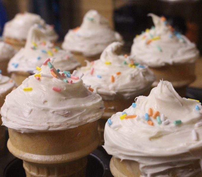 I recommend testing the cupcakes with a knife to ensure they are completely baked. Choose one cone and carefully poke a knife from the top of the cake to the bottom of the cone. If the knife has wet cake batter on it, continue to bake your cones at five-minute intervals until they are fully cooked. Cut your tester cake cone in half as your final check—once it is completely cooked and cooled off, it is time to get to decorating! I used a spoon to decorate my cupcakes—I scooped a tablespoon of icing on the top of each cupcake and then twirled the cone in one hand while using the back of the spoon to smooth out and create a swirl with the icing. Top your cakes off with some fun sprinkles and you’re done!